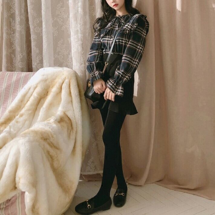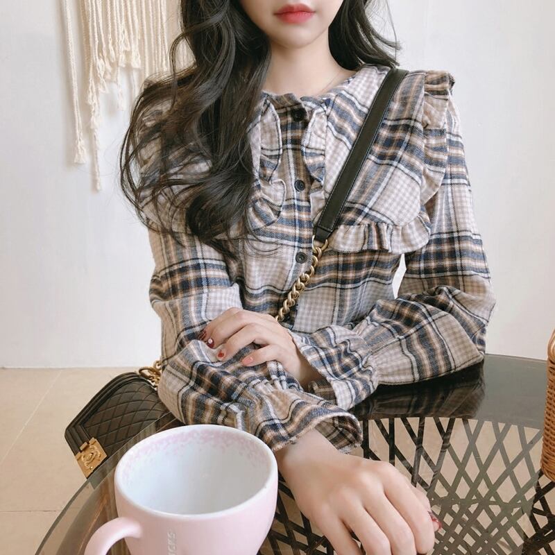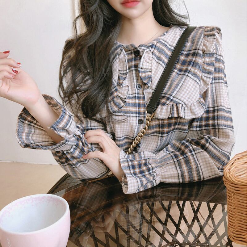 大きなフリルカラーチェックブラウス