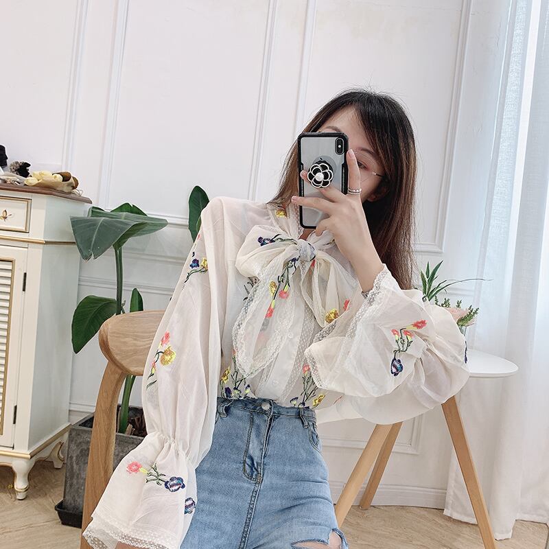 花刺繍リボンタイブラウス